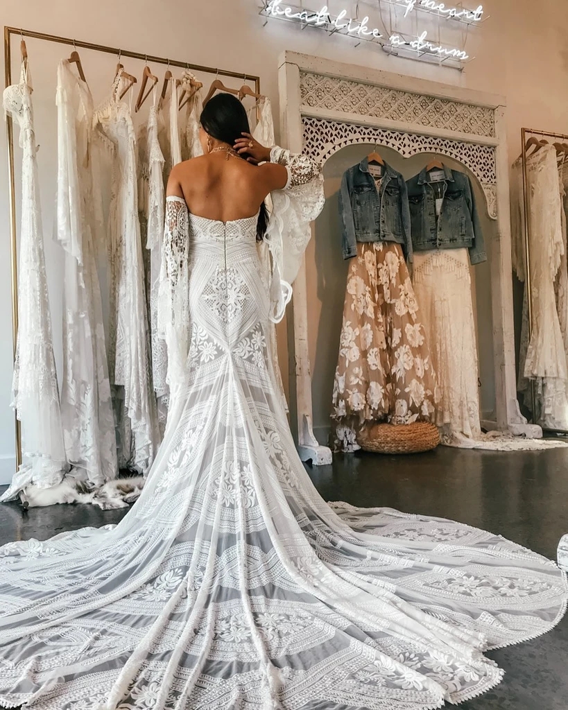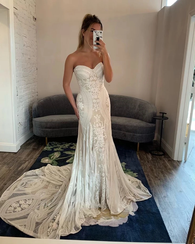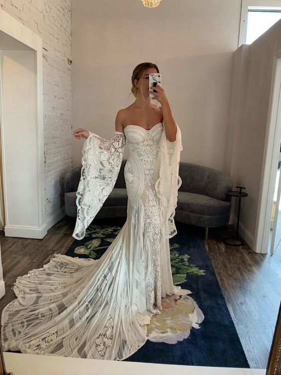 Boho Mermaid Sweetheart Long Sleeve Lace Bohomian Wedding Dresses,Fall Mermaid Bridal Dresses,958