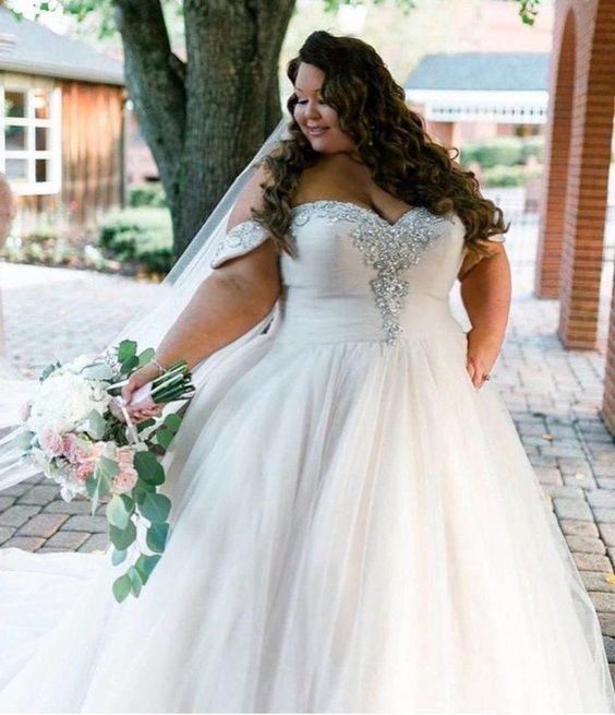 Plus size White Tulle Wedding Dress Off the Shoulder Pleated Beaded Bridal Gowns,981