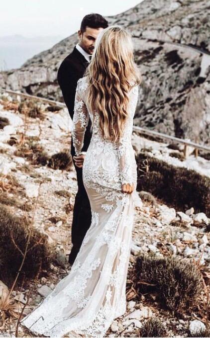 Long Sleeve Winter Lace Sheath Modest Boho Wedding Dress,986