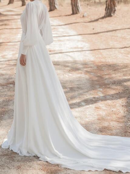 Tall Brides Modest Puff Long Sleeve Chiffon High Neck Simple Wedding Dress,987