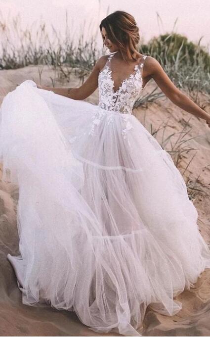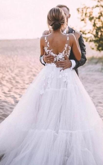 Simple V-neck Lace Tulle Ball Gown Floor-length Sleeveless Wedding Dress with Appliques,990