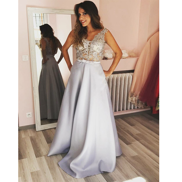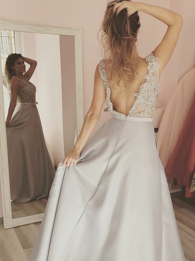 Silver Appliques Satin Prom Dress, Open Back See Through Prom Dresses, Wedding Party Dress, Evening Party Gowns, 123