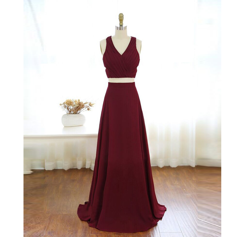 Burgundy V Neck Two Piece Prom Dress,Chiffon Formal Gown With Cut Out Back, 480