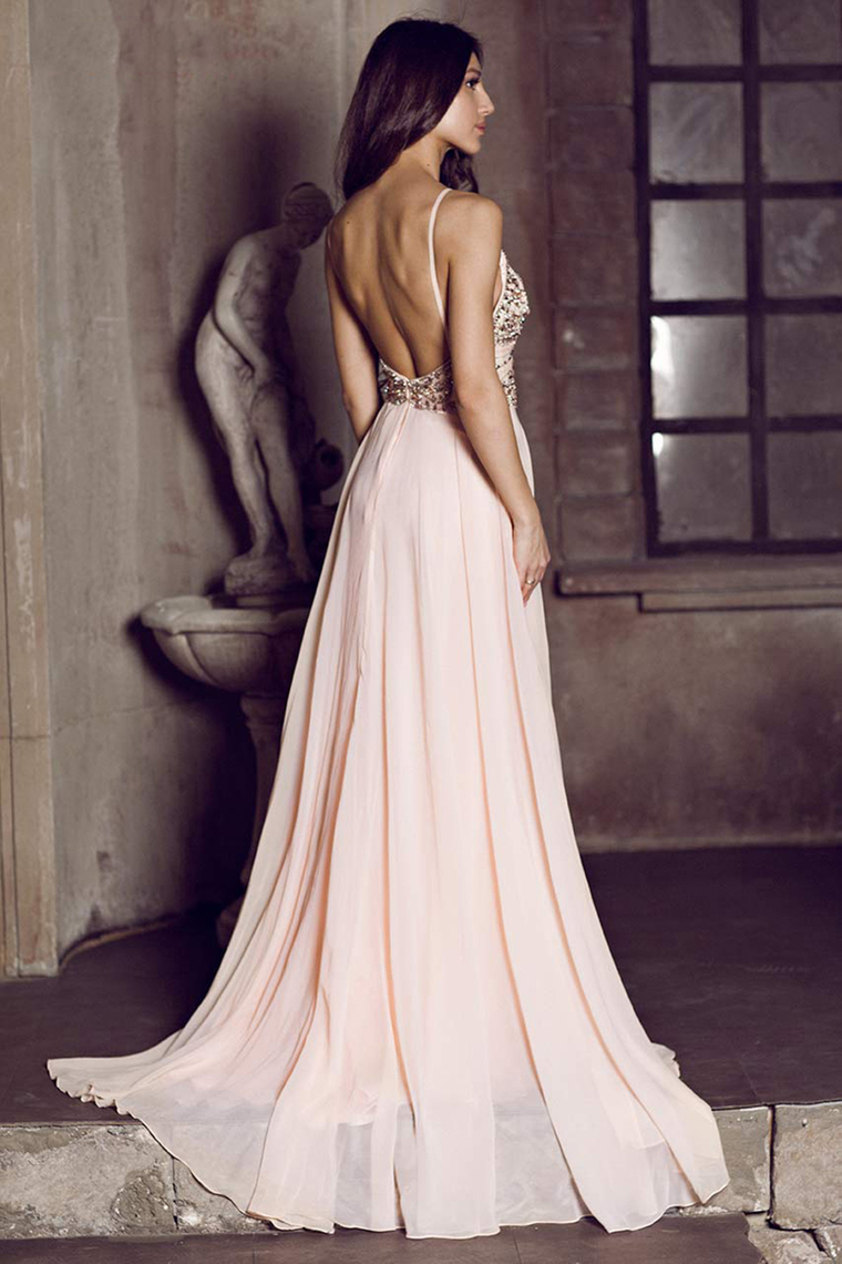 A line Beaded Spaghetti Straps Sexy Backless Long Pink Prom Dresses Gowns,484