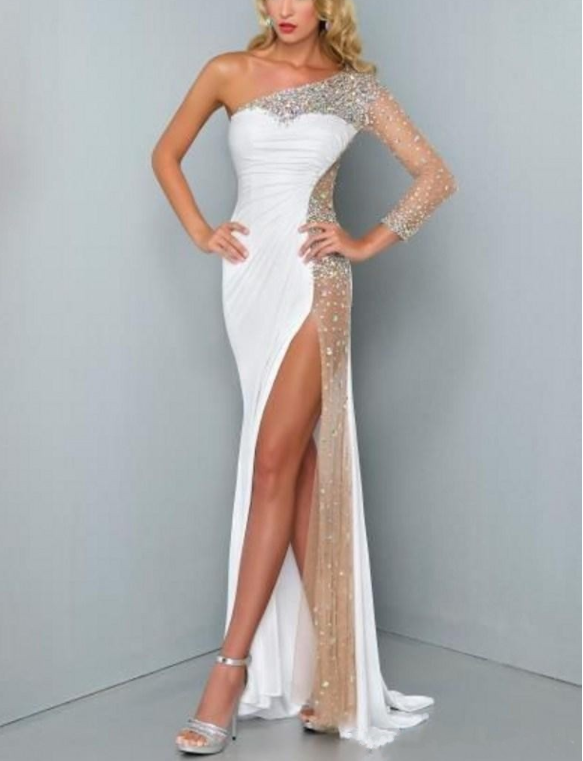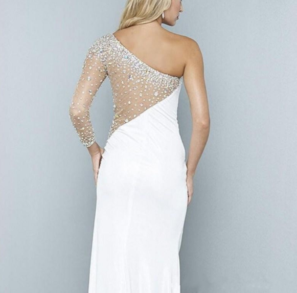 Sexy Long White Sheer Crystal One Shoulder Long Sleeve Side Split Chiffon Women Prom Dresses,836