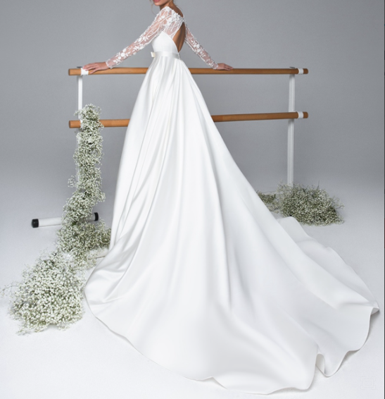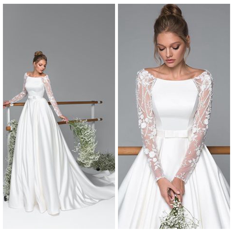 Jewel Neck Pure White Satin Wedding Dress Lace Applique A Line Wedding Dresses with Court Train Winter Long Sleeve Wedding Dresses,841