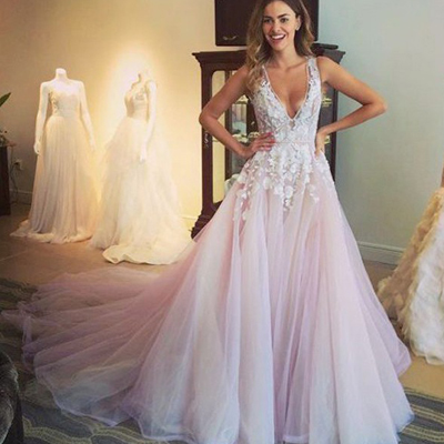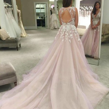 Long Wedding Dress, Tulle Wedding Dress, Sleeveless Bridal Dress, Open-Back Wedding Dress, V-Neck Wedding Dress, Wedding Dress with Long Train,890