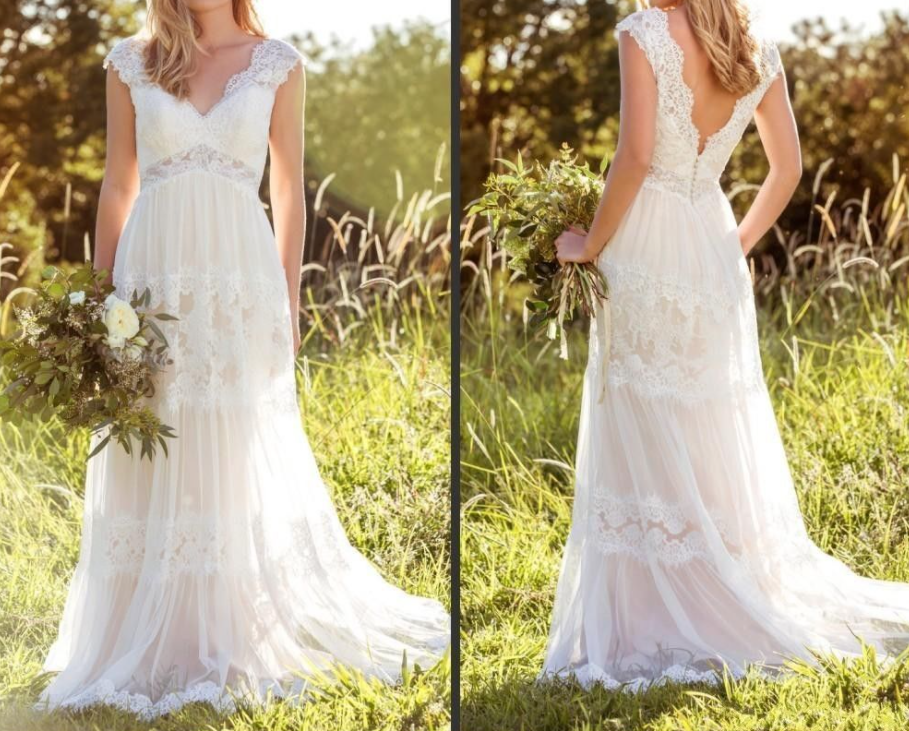 Empire Vintage V Neck Beach Lace White Wedding Dresses Bridal Gowns Custom,954